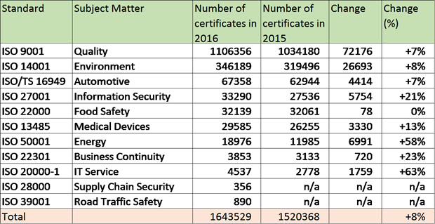 The survey identified that as at 31.12.16 certification bodies had issued 1.64 million certificates, with the overwhelming majority of these being to organizations wishing to provide assurance that they were meeting the requirements of the quality management system standard ISO 9001. Of this number 93% were still working to ISO 9001:2008 with only 7% working to the new version ISO 9001:2015. The biggest growth areas are energy management and IT.