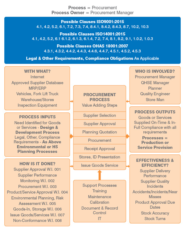 In the centre it can detail all of the Value Adding Steps, plus their sequence, that fall with the scope of the process. Please remember that any given process may involve multiple employees and departments within the organization. In this case departments represented include Procurement, QSHE and Stores/Warehousing.