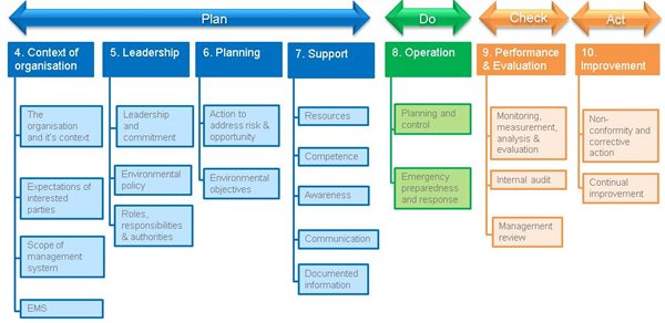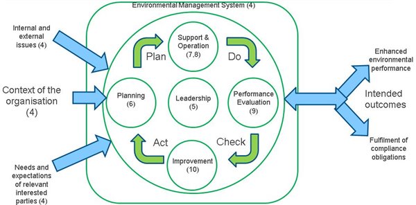 ISO 14001 uses PDCA as the basis for continual improvement of the EMS and enhanced environmental performance. The diagram below shows how the ISO 14001 requirements (clause numbers) align and interact with stages of PDCA.