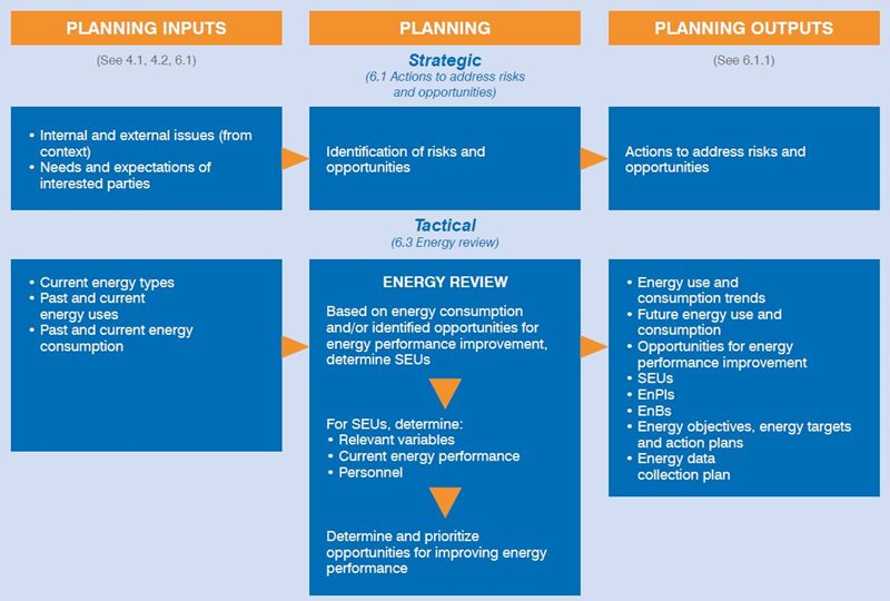 El ciclo Planificar-Hacer-Verificar-Actuar (PHVA) para la mejora de los procesos, tal y como se ha descrito anteriormente, se corresponde con los enfoques probados de la gestión de riesgos. Muchas organizaciones tienen el proceso de gestión de riesgos como un proceso fundamental, especialmente en torno a la tecnología de la información, las finanzas y la salud y la seguridad en el trabajo. A continuación se identifican los procesos clave de la norma ISO 50001 en los que el pensamiento basado en el riesgo es inherente: