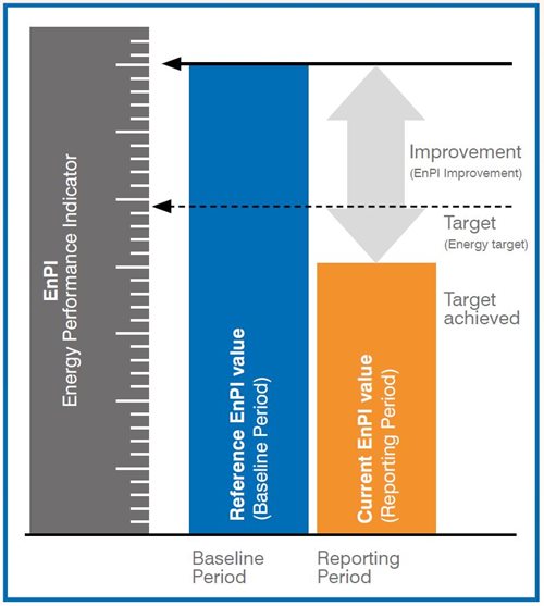 La mejora del rendimiento energético puede demostrarse mediante la mejora de los valores del EnPI a lo largo del tiempo, en relación con el EnB correspondiente. Puede haber situaciones en las que la mejora de la eficiencia energética se consiga a partir de una actividad que no esté relacionada con un USE o una característica clave. En esos casos, se puede establecer un EnPI y un EnB para demostrar la mejora del rendimiento energético. Cuando haya desviaciones significativas en el rendimiento energético, la Norma dice que deben investigarse.