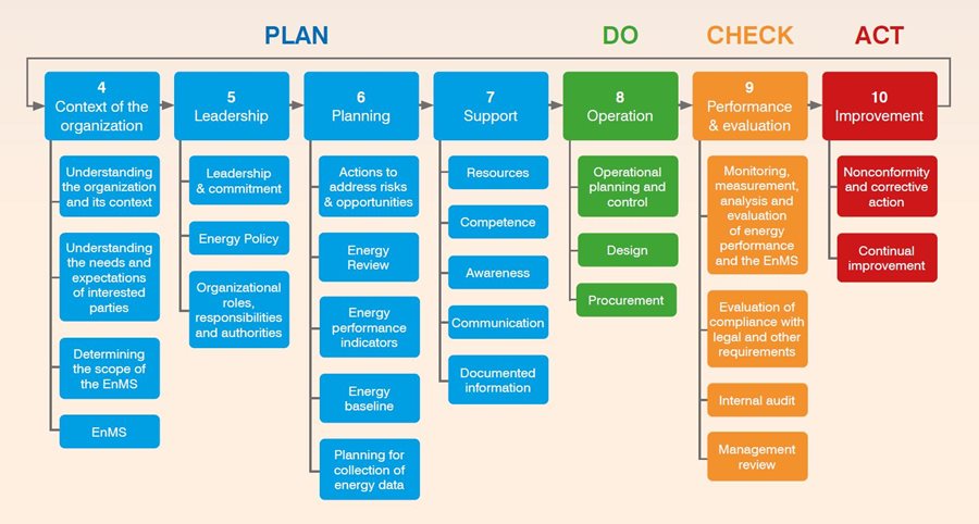 Un sistema de gestión de la energía (SGE) eficaz que esté alineado con la estrategia empresarial de una organización, permitirá la visibilidad de uso de la energía y las áreas en las que se puede mejorar el rendimiento. Proporciona políticas estructuradas, procesos, procedimientos y planes de acción para aplicar las oportunidades de ahorro energético. Así se consigue una mejora continua de la gestión energética.
