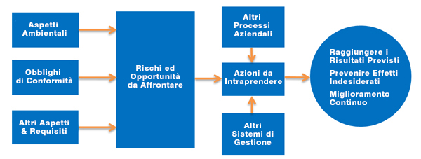 Lo standard ISO 14001:2015 ha un risultato atteso che è il miglioramento continuo delle prestazioni ambientali di un'organizzazione. Per raggiungere questo obiettivo, l'organizzazione deve capire cosa può aiutare a raggiungere questo obiettivo e cosa può essere di intralcio. Gli aspetti positivi diventano opportunità che devono essere potenziate se possibile, gli elementi di intralcio diventano rischi che devono essere rimossi o almeno mitigati.