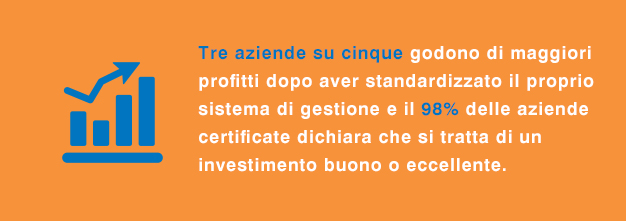 Quando sei pronto per far crescere la tua attività, la certificazione ISO fornisce credenziali immediate e riconoscibili a nuovi clienti e partner. Più di 1 milione di organizzazioni in oltre 170 paesi sono certificate ISO 9001, rendendolo lo standard più diffuso e più conosciuto al mondo. La certificazione ISO è un simbolo di fiducia e la prova che già impieghi le best practice standard del tuo settore durante le tue attività. Poiché sono riconosciute a livello internazionale, le certificazioni ISO trascendono la tua storia e la tua reputazione, permettendoti di ottenere un vantaggio competitivo man mano che ti muovi in nuovi territori.